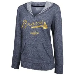 Women’s Atlanta Braves Majestic Threads Navy 2022 Gold Program Wordmark Pullover Hoodie