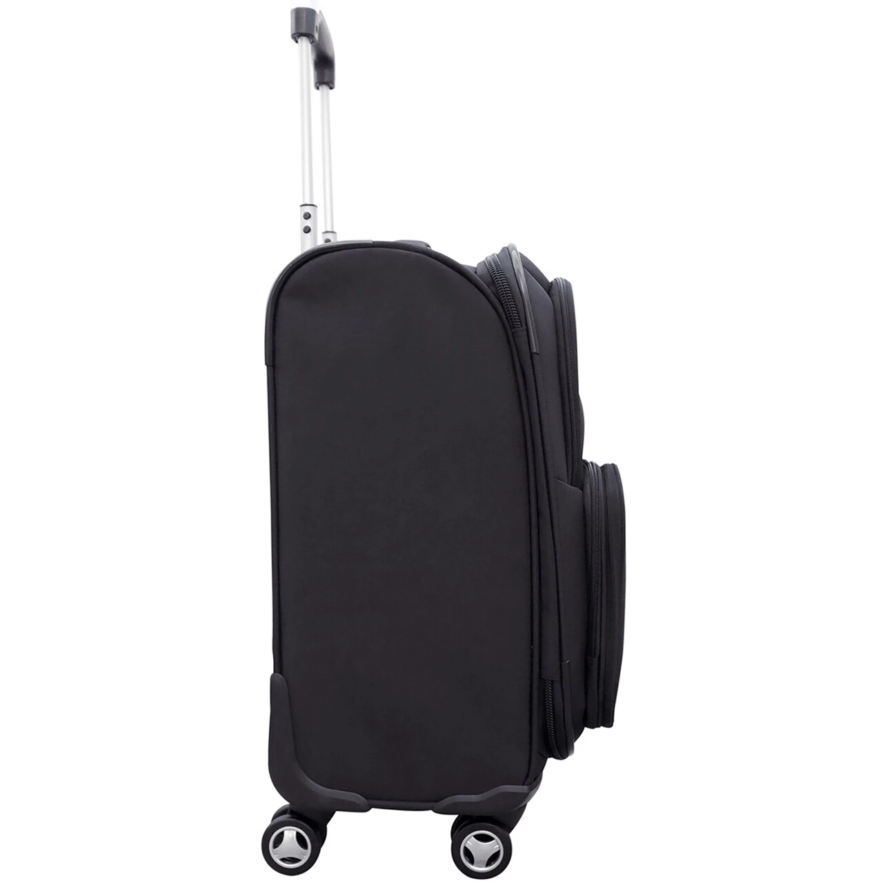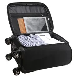 - The Carry-On Spinner Luggage has a spacious main compartment, fully lined interior with garment straps and an interior zipper pockets for delicate items or small accessories and two exterior zipper pockets
