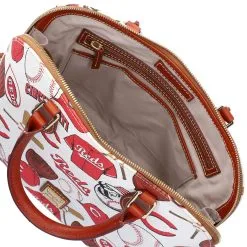 Flaunt your fashion sense and Cincinnati Reds devotion when you select this Game Day Zip Zip satchel from Dooney & Bourke. It features Cincinnati Reds-themed graphics printed all over with the sophisticated touch of leather trim. You also have the option of carrying around this chic purse by the double handles or adjustable shoulder strap that is detachable.