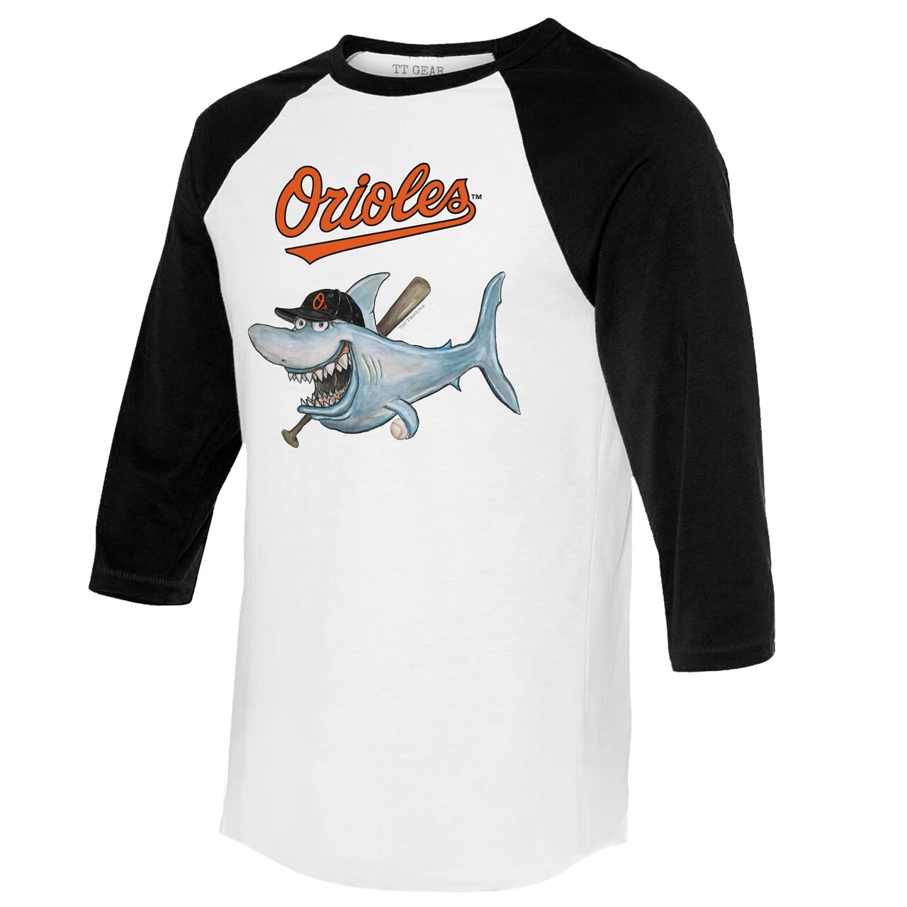 Show off your enthusiasm for Baltimore Orioles game day with this Shark 3/4-Sleeve Raglan T-Shirt from Tiny Turnip. The raglan sleeves feature a wider underarm area that provides more space for movement, and the 3/4-sleeve length gives you an effortlessly cool and casual look. Matching graphics are also available in youth, toddler and infant sizes, so the whole family can have the same spirited look for the next Baltimore Orioles game.