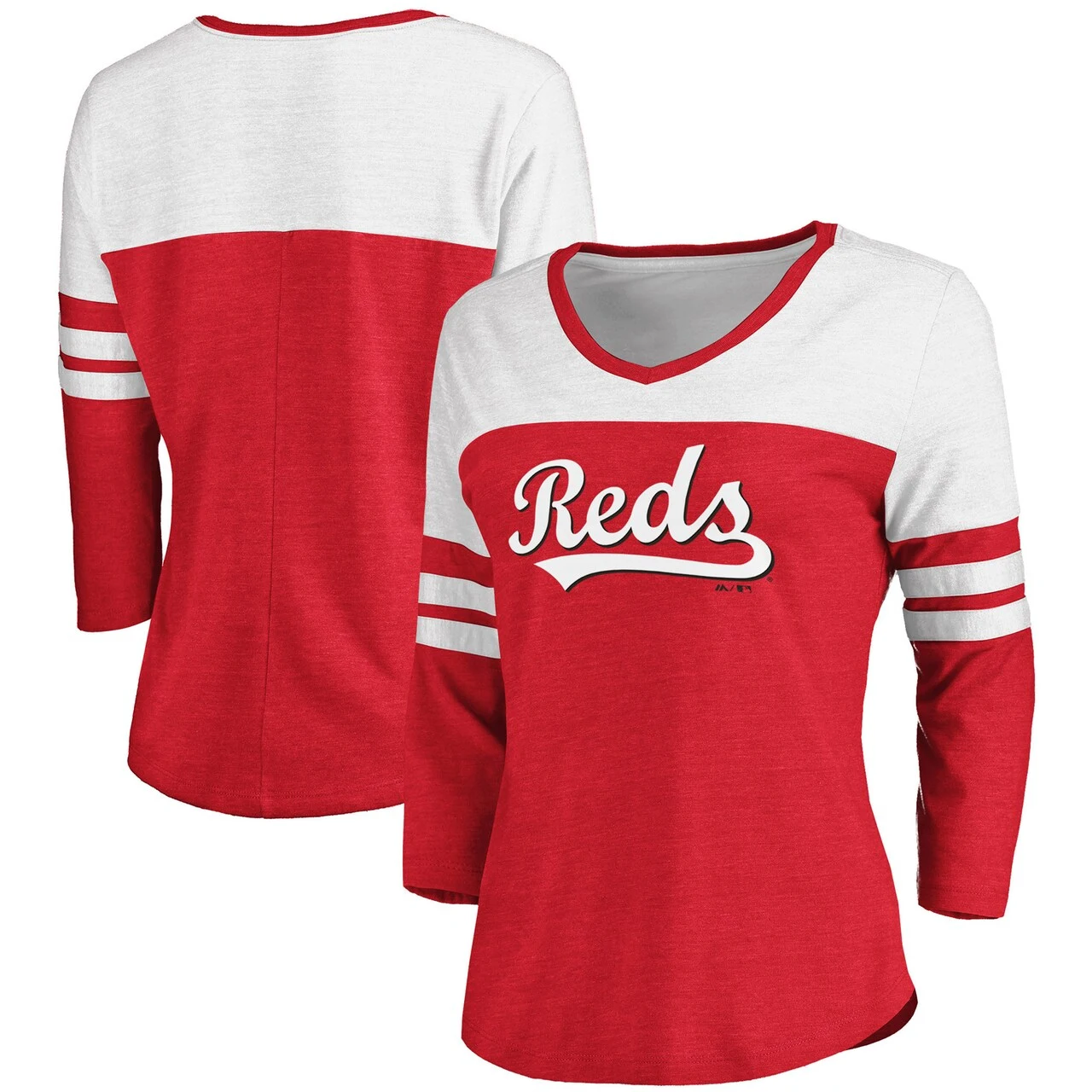 Get ready to show off your unwavering Cincinnati Reds pride with this Fanatics Branded Official Wordmark 3/4 Sleeve V-neck T-shirt. The crisp Cincinnati Reds graphics across the chest will let everyone know who you’re rooting for and its eye-capturing V-neck and contrast-color inserts on the sleeves will always offer the ideal combination of appeal and comfort. Pair this stylish top with your favorite cap for the ultimate game day look!