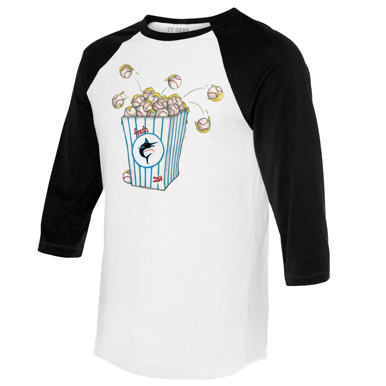 Show off your enthusiasm for Miami Marlins game day with this Popcorn 3/4-Sleeve Raglan T-Shirt from Tiny Turnip. The raglan sleeves feature a wider underarm area that provides more space for movement, and the 3/4-sleeve length gives you an effortlessly cool and casual look. Matching graphics are also available in youth, toddler and infant sizes, so the whole family can have the same spirited look for the next Miami Marlins game.
